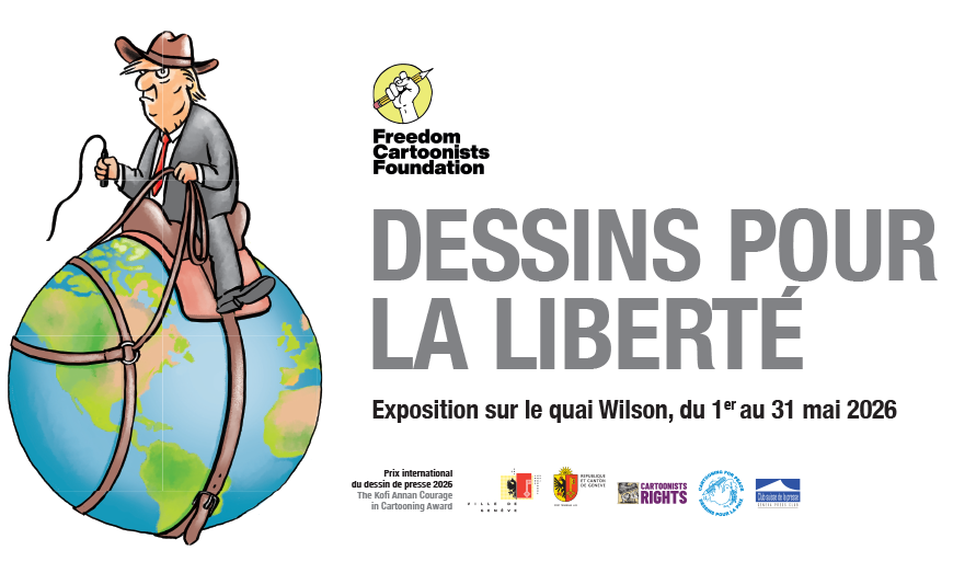 La remise du Prix international s’accompagne traditionnellement d’une ex- position de dessins de presse dans la plus belle galerie d’art du monde, le quai Wilson, au bord du Lac Léman. L’édition 2024 est consacrée à trois sujets d’actualité sous la plume de dessinateurs du monde entier : les droits des femmes, les guerres contemporaines et l’intelligence artificielle. Cette exposition, réalisée en partenariat avec le réseau Cartooning for Peace, basé à Paris, est visible pendant tout le mois de mai. It aims to provoke thought and inspire political reflection through the unique lens of editorial cartoonists from all over the world.